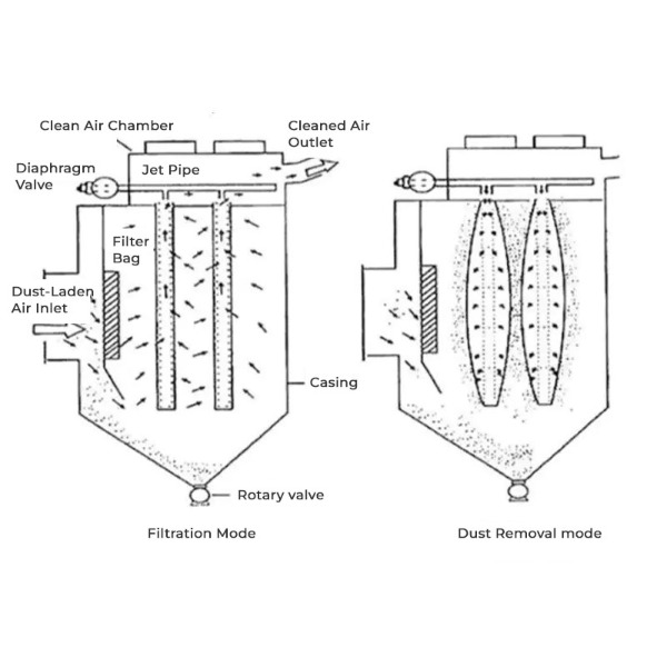 Sběrač prachu sáčkového filtru funguje tak, že protlačuje vzduch nebo plyn přes filtrační sáčky, které zachycují prachové částice. Vyčištěný vzduch prochází sáčky, zatímco prach se hromadí na vnější straně tkaniny, která je periodicky čištěna stlačeným vzduchem.
