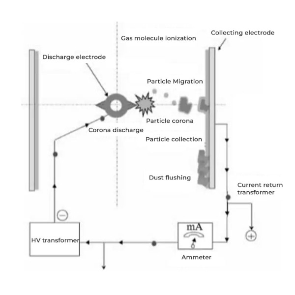 Ionizace částic: Když spaliny nebo odpadní vzduch vstupují do odlučovače, výbojová elektroda generuje vysokonapěťové elektrické pole. Toto pole ionizuje suspendované částice a dává jim záporný náboj.