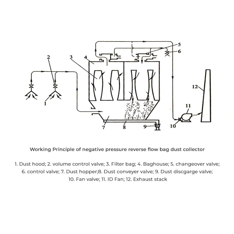 Sběrač prachu s podtlakovým zpětným foukáním je zařízení na odstraňování prachu široce používané v průmyslové výrobě. Funguje tak, že využívá podtlak k zpětnému vhánění vzduchu k odstranění prachu nahromaděného na filtračních sáčcích. Mezi hlavní součásti tohoto zařízení patří sběrná nádoba na prach, filtrační sáčky, podtlakové dmychadlo a zpětné ofukovací zařízení. Ve srovnání s tradičními odlučovači prachu nabízejí sběrače prachu s podtlakovým zpětným ofukováním vyšší účinnost odstraňování prachu a nižší provozní náklady, díky čemuž jsou mezi společnostmi stále oblíbenější.